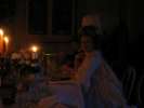 Dusk was approaching when we sat down to dine. The flower bouquets on the table were illuminated by a multitude of candles. Fortunately, there were enough servants this time to serve all. The food was delicious: A starter of fish on a salad bed, followed by soup with Maultaschen - as specialty of the region -, lime sherbet, meat with tiny Knödel and mushroom sauce, and a pear with white chocolate sauce as dessert. The cheese was served much later because the musicians were already waiting upstairs to accompany the dance.