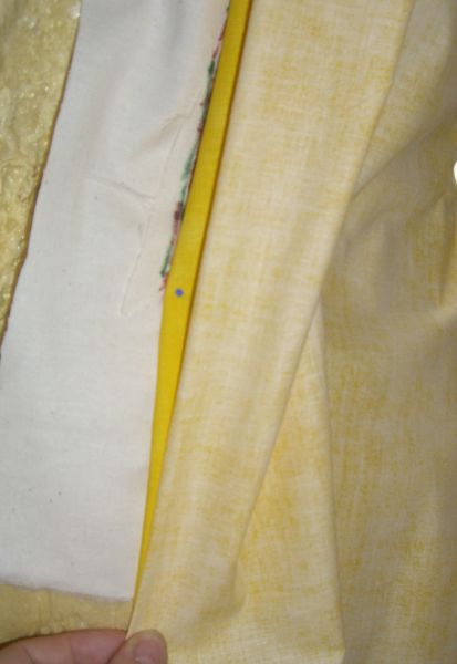Zuerst mal etwas Nomenklatur: Es gibt die Seitennaht im Oberteil (markiert) und die Seitennaht im Rockteil (ganz unten rechts, senkrecht verlaufend). Bei einer Robe wäre da der noch zugeheftete Taschenschlitz. Dazwischen verläuft waagerecht die Oberkante des Rockteils, die nun in Falten gelegt wird. Die Seitennaht im Oberteil reicht ein Stück weit über die Oberkante des Rockteils hinaus (ganz schwach sieht man im Bild die Stiche der hier bereits gekappten Kappnaht1), weil wir an der Oberkante Rock ja viel zugegeben haben, d.h. die Taille liegt tiefer als die Oberkante des Rockteils. Das untere Ende der Naht markiert die Taillenhöhe. |
