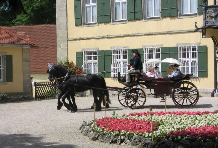 The thunderstorm grumbled all night but hardly managed to drive the heat away. The next morning was already as hot as the day before! As soon as beakfast was finished, the coach and horses arrived for the first outing. Jana and Marcus accompanied the coach on horseback. Meanwhile, the others spent the morning chatting (again!), walking in the park or simply idling. The coach came back after almost two hours, just in time for lunch. However, yet another thundestorm had drawn near and decided to unload its wet cargo just as we were supposed to betake ourselves to the pavillion in the park where lunch was to be served. After a while, many a seat had become slightly wet.