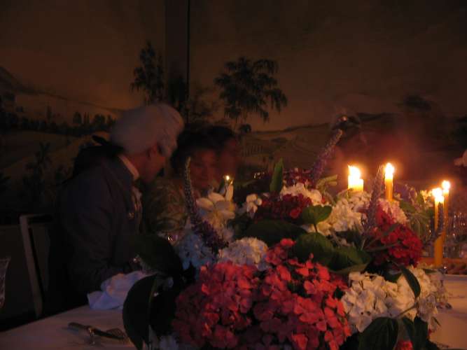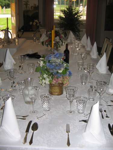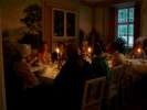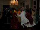 Dusk was approaching when we sat down to dine. The flower bouquets on the table were illuminated by a multitude of candles. Fortunately, there were enough servants this time to serve all. The food was delicious: A starter of fish on a salad bed, followed by soup with Maultaschen - as specialty of the region -, lime sherbet, meat with tiny Knödel and mushroom sauce, and a pear with white chocolate sauce as dessert. The cheese was served much later because the musicians were already waiting upstairs to accompany the dance.
