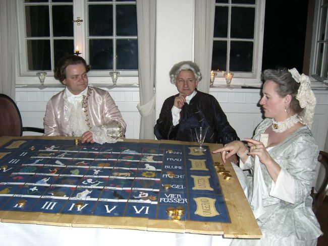 habe. Nach Musik (Flöte und Cembalo) und Tanz gibt man sich dem Laster