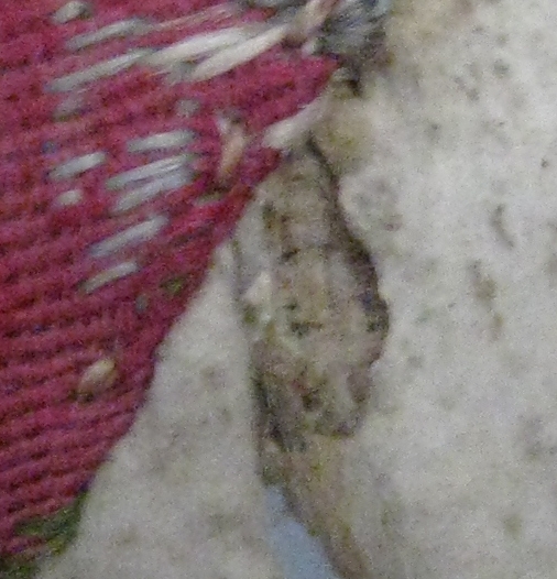 Beim Stecker wurden offenbar die äußeren Stoffschichten zuerst angebracht, die Kanten auf die Innenseite umgeschlagen, und dann das Futter mit untergeschlagenen Nahtzugaben aufgesetzt. Nur entlang der Oberkante und ein kleines Stück um das Hörnchen herum ist das gleiche Kantenband aufgesetzt wie bei der Schnürbrust. (Bild 6)