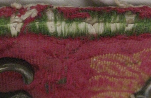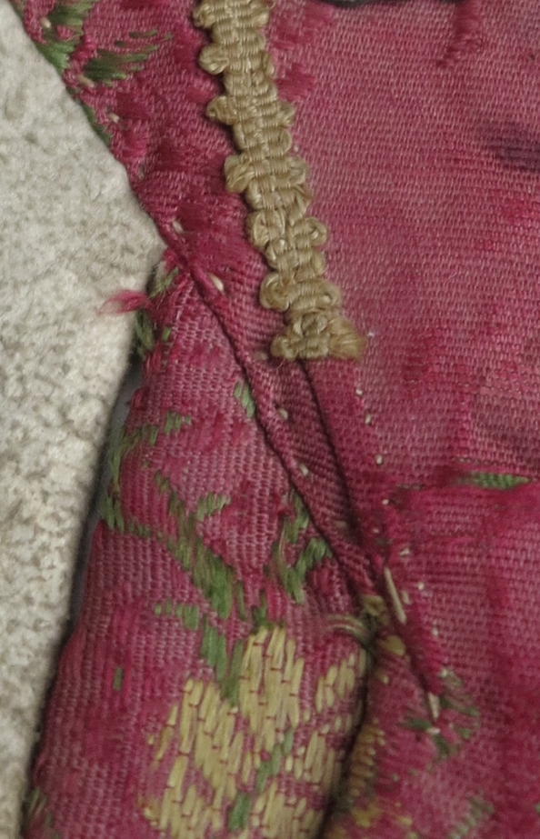 Der Oberstoff wurde gesondert zusammengesetzt und nachträglich aufgelegt, denn er ist nicht durchsteppt. Außerdem entspricht der Nahtverlauf im Oberstoff zum Teil nicht dem in der Basis. Die schräge Borte vorn z.B. verdeckt keine Naht im Oberstoff, obwohl sich in der Basis eine scheinbar parallel dazu verlaufende Naht befindet: Im Oberstoff ist hier nur eine Falte eingelegt, die unter der Zierborte hervorkommt und sich in der Schneppenspitze in Nichts auflöst (Bild 2). Tatsächlich verläuft die Borte schräger als die Naht innen und ist im unteren Abschnitt sogar leicht gebogen (die Naht hingegen ist völlig gerade) und kaschiert so die eigentliche Konstruktion. Bei der schrägen Borte im Rückenteil verhält es sich ähnlich.