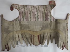 Die hintere Schneppe sowie die beiden daran angrenzenden Zaddeln sind mit weißem Glattleder gefüttert, alle anderen Zaddeln hingegen mit dem gleichen Leinen wie der Korpus. Die Schulterträger sind stark versteift und so in Form gebracht, als ob sie sich um eine Schulter schmiegen, sind aber so flexibel, daß man sie theoretisch ohne Kraftaufwand geradebiegen könnte. Wie das erreicht wurde, läßt sich nicht feststellen. Fischbein kann es nicht sein. Möglicherweise wurde die äußere Basislage geleimt und/oder Papier zwischengelgt. Papier wurde übrigens auch entlang der Vorderkante verwendet, und zwar direkt unter dem Oberstoff. Die vier Schnürösen sind nur sehr grob mit sieben, acht Stichen umstochen.