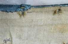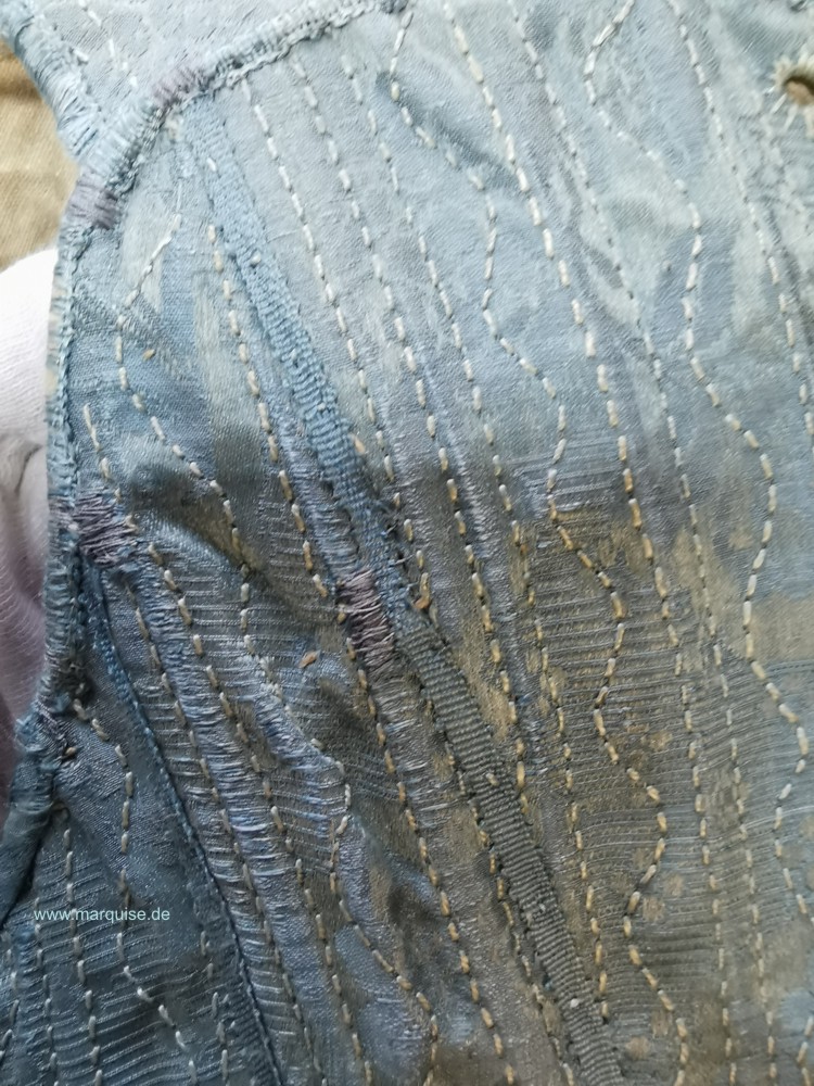 KonstruktionDa die Nähte der Stabtunnel durch den Oberstoff ausgeführt wurden, aber nicht durchs Futter, ist anzunehmen, daß die Stäbe zwischen der Seide und einer Leinenschicht einerseits, und einer unsichtbaren Zwischenschicht andererseits gefaßt sind. Wo der Oberstoff durchgewetzt ist, kann man eine Lage aus gebleichtem, relativ offen gewebtem Leinen erkennen. Der Oberstoff, der nicht allzu steif sein dürfte, wurde also mit Leinen gedoppelt, bevor er auf eine weitere Stofflage gesetzt und dann alle drei Lagen durchsteppt wurden. Die unterste der drei Lagen kommt trotz aller Beschädigungen nirgendwo zum Vorschein. Es könnte sich dabei um Leinen handeln, aber einige Fadenenden, die auf der Tiefe der Schnürösen hervorschauen, sehen in Farbe und Dicke eher nach Rupfen aus. Sie könnten ein Teil dieser unteren Lage sein.