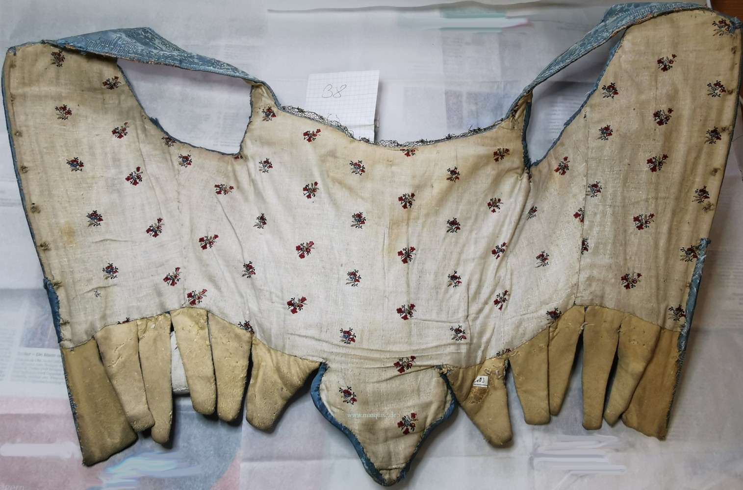 Die zwar laienhaft ausgeführten, aber unauffälligen Reparaturen, die ich für zeitgenössisch halte, sprechen dafür, daß diese Schnürbrust häufig und über längere Zeit hinweg getragen wurde. Das unterscheidet sie von vielen anderen erhaltenen Stücken, die Stichwort conservation bias oft nur deswegen erhalten blieben, weil sie z.B. nicht richtig paßten und daher kaum getragen wurden. In Konstruktion und Größe gleicht sie der braunen Schärdinger Schnürbrust, vor allem aber wurde bei beiden der gleiche Futterstoff verwendet. Mit sehr großer Wahrscheinlichkeit wurden beide in der gleichen Werkstatt gefertigt und vermutlich auch für dieselbe Kundin.