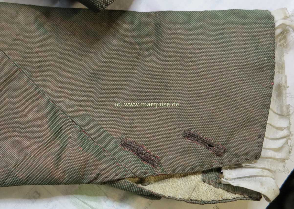 Der Erhaltungszustand des Spenzers ist hervorragend. Bis auf eine abgewetzte Stelle an der dünnen Seide des Schößchenfutters und winzige Schadstellen im Oberstoff, die theoretisch auch schon bei der Herstellung entstanden sein könnten, konnten wir keinen Vergang feststellen. Der Rips wirkt, als wäre er gerade erst gewebt worden. Man fragt sich unwillkürlich, ob die Jacke jemals getragen wurde, und wenn ja: mehr als einmal?