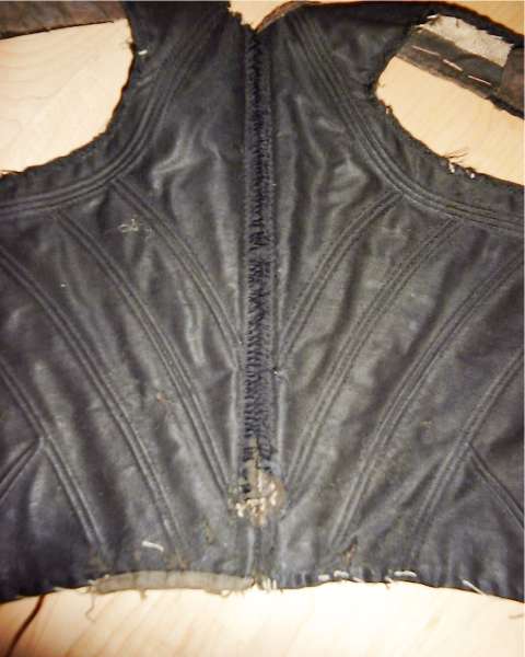 Diese ersten drei Stofflagen sind zusammen verarbeitet. Nahtzugabe für Rupfen ca. 1 cm, sonst 2-3 cm. Nach Ausführen der Seiten- und Rückennaht wurden alle drei Schichten umgelegt und ca. 1mm neben der Naht mit dickem braunem Garn und nicht nach außen durchtretenden Handstichen anstaffiert, 6 mm daneben noch einmal mit schwarzem Garn durchsteppt. In den so entstandenen Tunneln stecken Fischbeinstäbe, je einer zu beiden Seiten der Rücken- und Seitennähte. Am unteren Rand wurden die äußersten zwei Schichten um die Kante des Rupfens geschlagen und eingeschnitten.