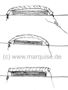 Warum soll die Kantille länger sein als die Pappe breit ist? Wäre die Kantille nur so lang wie die Pappbreite, dann würde man von der Seite her den Querschnitt der Pappe sehen und darüber eine "Röhre", die obenauf liegt (Skizze links, untere Abb.) Die Kantille sollte lang genug sein, um sich jenseits der Pappkante nach unten biegen und so die Pappe verbergen zu können (Skizze links, obere Abb.) Nach meiner Erfahrung biegt sich die Kantille trotz Überlänge nicht freiwillig in der gewünschten Weise um die Ecke des Kartons herum, sondern versucht, sich in einem gleichmäßigen Bogen aufzustellen, wofür sie dann aber wieder zu kurz ist. Man muß sie also, wenn man einige oder alle Stiche gemacht hat, sanft um die Ecke streichen. Alternativ kann man die Kantille auch noch etwas länger machen - so lang, daß sie sich in einem glatten Bogen über der Pappe wölben kann (Skizze links, mittlere Abb.) Das sieht auch sehr gut aus; daß dabei zwischen Kantille und Pappe etwas Luft bleibt, macht nichts. Wenn die Pappe dünn genug ist, kann man auch zwei Pappteile aufeinanderlegen, eines kleiner als das andere, um den Bogen zu unterstützen.