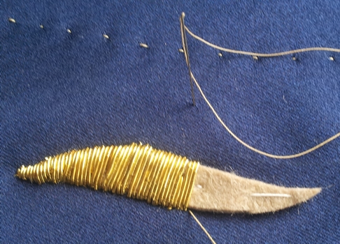 Den ersten Stich an einem der Enden der Form macht man ein wenig außerhalb der Pappe, um das oben erwähnte herunterkippen von der Kante zu verhindern. Stich also ein wenig diagonal außerhalb der Pappe hoch, schneide so viel Kantille ab, wie die Pappe am Ende breit ist, fädle sie auf die Nadel auf und stich auf der anderen Seite der Pappe (aber, wie gesagt, noch außerhalb davon) wieder herunter, parallel zu den zuvor aufgemalten Strichen. Diese erste Kantille liegt vor dem Ende der Pappe. Die nächste liegt schon auf der Pappe. Auch hier sticht man ein wenig (ca. 0,5 mm) außerhalb der Pappe hoch. Die Kantille, die man dann abschneidet, muß je nach Dicke der Pappe, 1-1,5 mm länger sein als das Pappstück, das sie überspannen soll. Fädle sie auf und stich wiederum ca. 0,5 mm außerhalb der Pappe nach unten.
