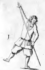 Was ich davon halte: Es sieht so aus, als ob zu einer Zeit, als Knöpfe an Männerwämsern in Mode waren (17. Jahrhundert), Rapiere getragen wurden, die so lang waren, daß man sie dicht am Körper ziehen und obendrein einen Fuß vom Boden heben mußte, weil der Arm sonst nicht lang genug gewesen wäre, um das Teil komplett aus der Scheide zu ziehen (siehe Bild rechts)². Das ist zwar nicht Mittelalter, aber für manche Leute ist Mittelalter eh alles vor 1900, also ignorieren wir das mal. Es könnte durchaus einen Zusammenhang zwischen Knöpfrichtung und Blankwaffen geben. Allerdings würde das nur erklären, warum die Knöpfe an Männerkleidung rechts sitzen, und nicht, warum die Seite beiden Frauen zuerst genauso war und dann gewechselt hat.