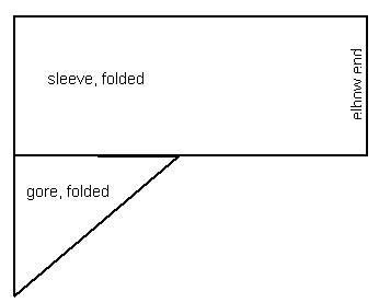 Then attach the four long gores, one to each side of the body, going from the hem up. When that is done, fold the whole thing along the shoulder line and close the side seams down the slanted sides of the side gores. Put the sleeves in the usual way (turned right side out, stuck into the body... you know), then close the side seam the rest of the way between the underarm and side gores. Make up the hem - it helps if you cut the lower ends of the side gores to slightly slant up towards the side, otherwise you'll have problems turning the hem at the corners. Also makes for a straighter hemline. But don't go so far as cutting the hem completely rounded.