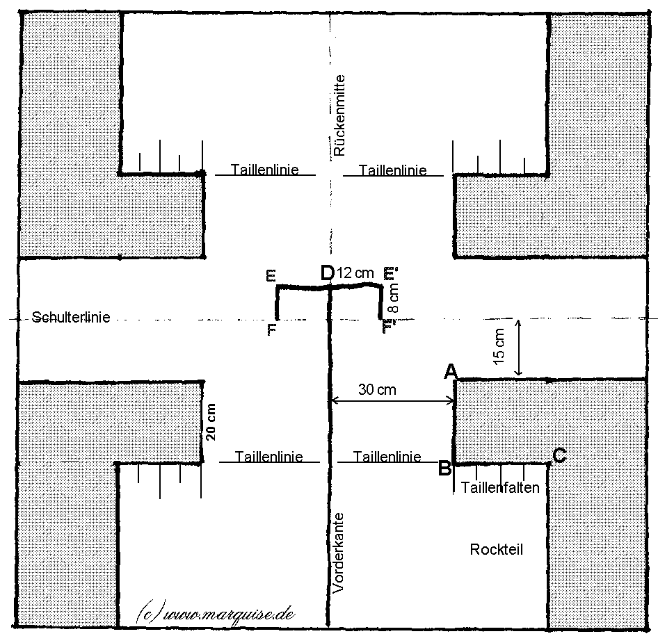 measurement. That is usually OK for someone 160-165 cm Garsault's 60 cm length are barely enough for the shorter women of his time. Decide how long you want it (hip, mid of thigh, almost to the knee), then measure from the top of the shoulder over che chest and down to wherever. If your fabric is 140- 50 cm wide, you'll need twice that length of fabric, usually 150-180 cm. For other fabric widths, please do the calculations yourself. The skirt part should be at least 20 cm wider than the body on either side, i.e. the fabric width (BW+30*)/2)+20. In case of a 120 cm breast width, you'd need (120+30*)/2 + 20 = 95, i.e. you'd have a problem if your fabric was only 90 cm wide. In this case, buy more fabric and cut some extra strips to widen the skirt part. Piecing is good 18th century practice and nothing to be ashamed of! In most cases you'll have to piece the sleeves, too: As it happens, the measurement from wrist to wrist (with arms outstretched) is more or less the same as the one from head to toe, so anyone taller than the fabric is wide will have to add on to the sleeves. The markings in the pattern in German; they mean: