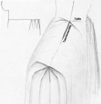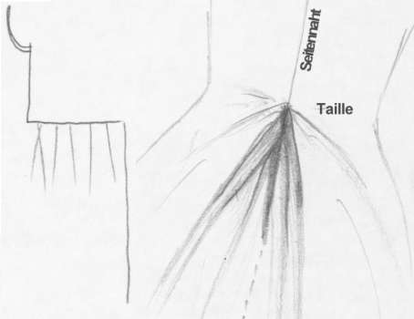 In the 1740s the paniers are often very wide, but flat in front and back. Same goes for later, ceremonial styles. The skirt - both robe skirt and jupe - must be accordingly wider, possibly widening even more towards the hem, while the top of the robe sticks with whatever was in fashion at the time. In this case, we simply widen the skirt parts, both in front and back, to accomodate the wider panier. The top of the skirt, measured from bodice side to skirt side seam, must correspond to the width of the panier between those points, and some. This "some" is pleated into a fan shape at the point where the panier angles down, instead of the pleats we have, until now, pleated into the side seam. See sketches below for narrow (left) and wide (right) paniers.