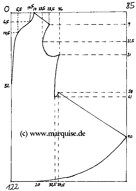 The hem line of the justaucorps has probly suffered most. It should be a smooth curve, every point being 60 cm away fromt the small curve at waist level. If necessary, correct it in the full-size pattern. Give at least 5 cm seam allowance round the hem.