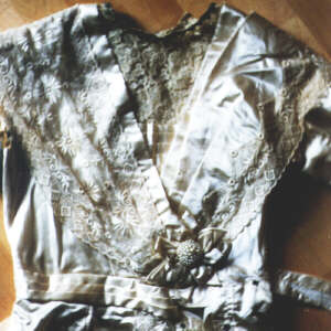 The collar is rimmed with silver embroidery now stained black. The right edge is obviously chinoiserie,