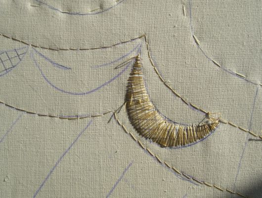 Es besteht aus 1,3 mm breitem, vergoldetem Plätt (=Plasch), der im Zickzack gelegt und bei jedem Zick und Zack mit einem Seidenfaden festgenäht wurde. Um der Biegung folgen zu können, mußte ich an der Innenbahn dichter stapeln als an der Außenbahn, und hin und wieder habe ich einen etwas kürzeren „Zick“ gemacht, der vom nachfolgenden überlappt wird.