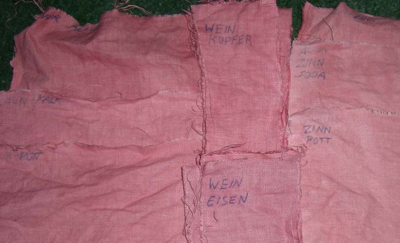 Was die Wirkung der Beizen auf den Farbton angeht: Zinn macht das Rot… äh, Rosa gelblicher, Kupfer geringfügig bläulicher, Eisen macht deutlich bläulicher und etwas dunkler. Die Wirkung ist in allen Fällen sehr schwach, aber ich schätze, wenn es richtig rot geworden wäre, sähe man mehr. Ich muß dann wohl also doch noch das Experiment machen, das Leinen vor dem Beizen mit Gerbsäure auszukochen.
